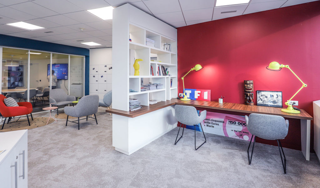 Redonner une dynamique aux bureaux, remplacé l’ambiance tertiaire par un esprit plus domestique, et plus en échos avec l’ADN de la chaîne, un “comme à la maison” qui prend tout son sens pour TF1. Cela se traduit par des matériaux sobres, du bois clair, des couleurs douces dans les espaces de travail, ponctué par des taches colorées dans une ambiance plus décomplexée et du mobilier homelike.